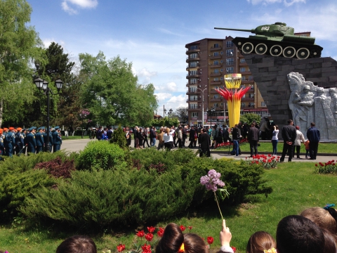 На Площадь Победы к памятнику «Танк Т-34», установленному в честь 30-летия сокрушительного разгрома немецко-фашистских войск под городом Оржоникидзе, пришли сотни людей.