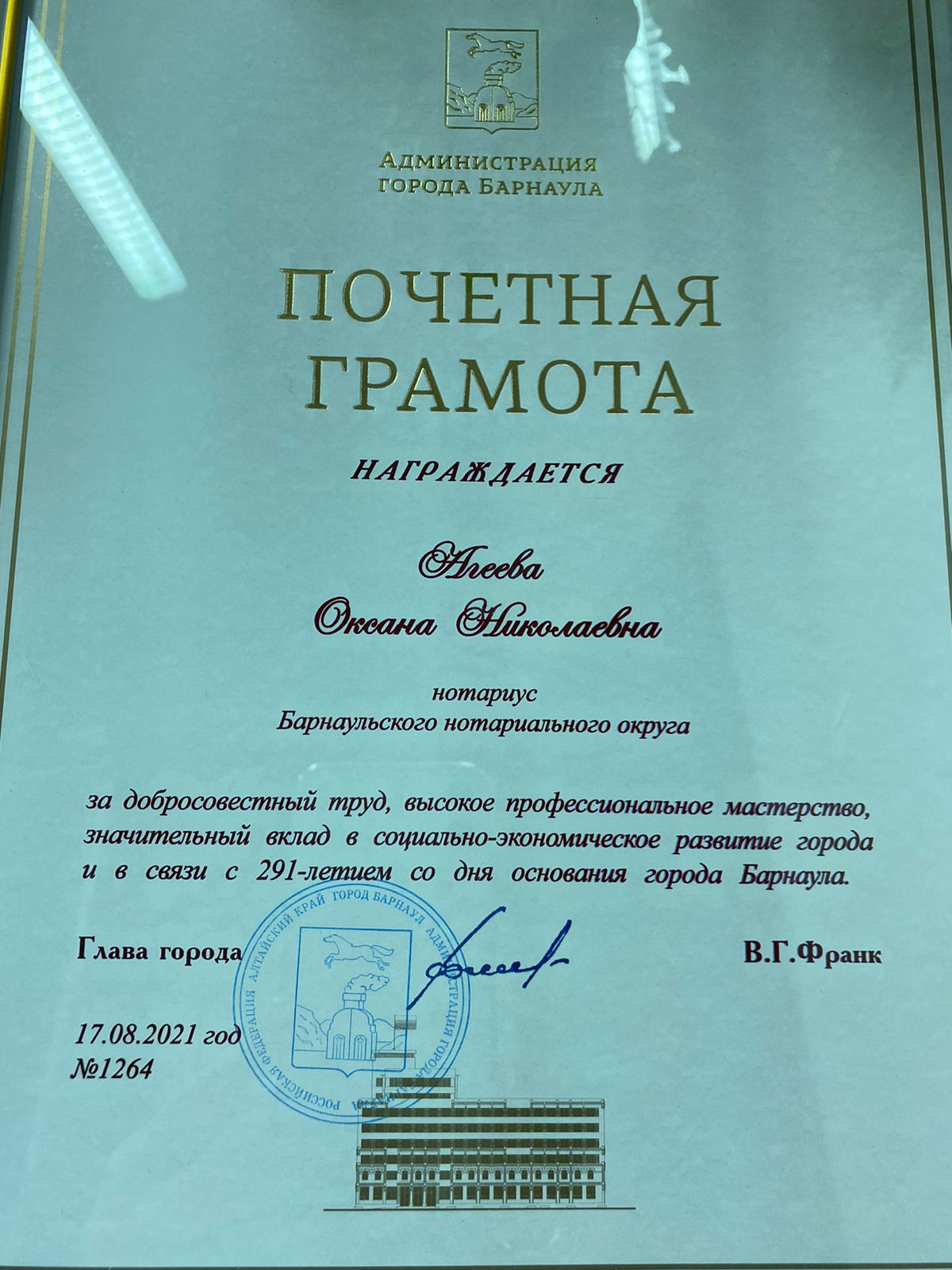 Вице-президент АКНП, нотариус г. Барнаула была отмечена за добросовестный труд, высокое профессиональное мастерство, значительный вклад в социально-экономическое развитие города и в связи с 291-летием со дня основания г. Барнаула.