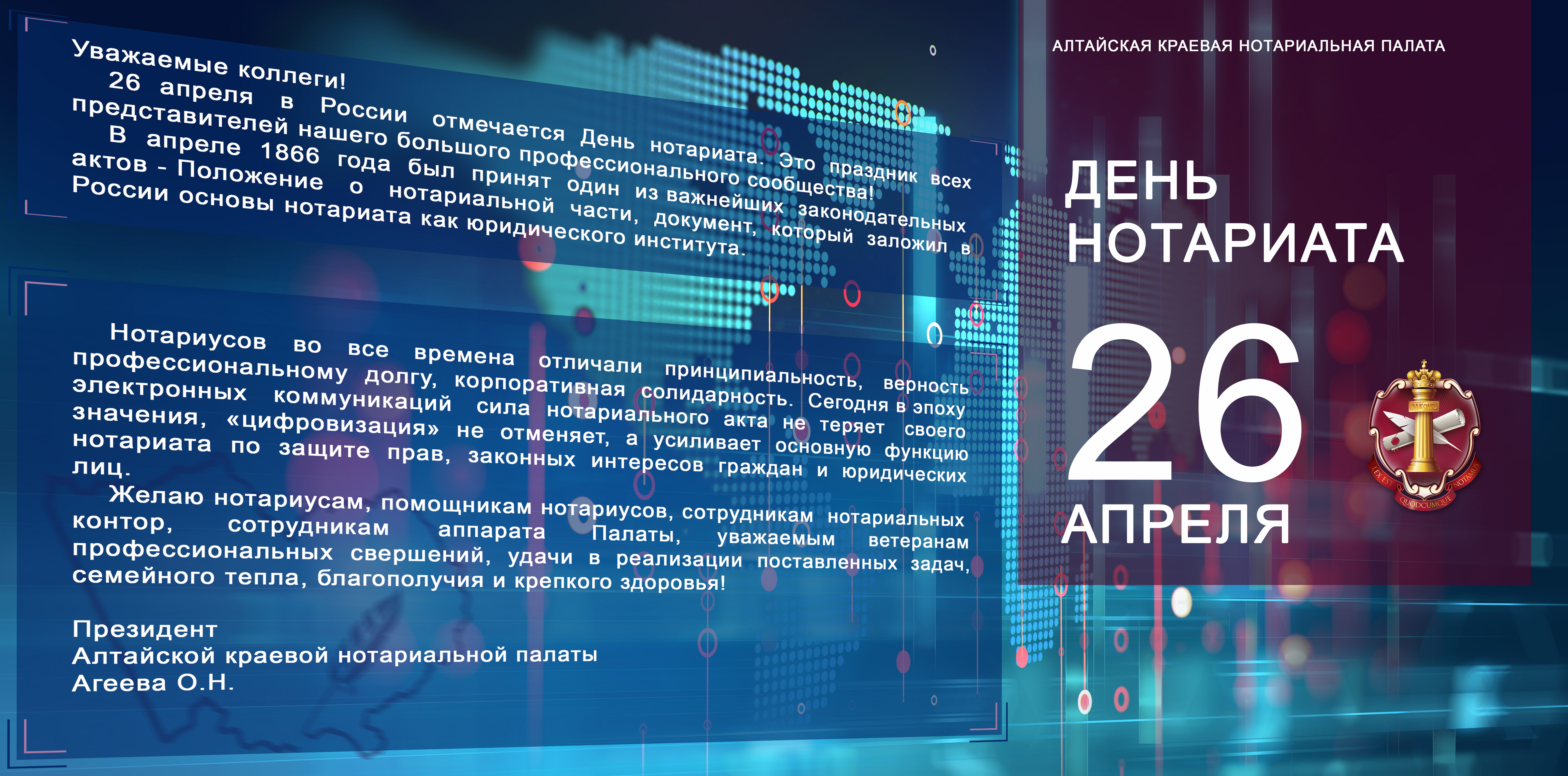 Желаю нотариусам, помощникам нотариусов, сотрудникам нотариальных контор, сотрудникам аппарата Палаты, уважаемым ветеранам профессиональных свершений, удачи в реализации поставленных задач, семейного тепла, благополучия и крепкого здоровья!