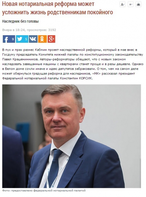 Газета «Московский комсомолец» опубликовала интервью президента Федеральной нотариальной палаты К.А. Корсика на тему реформирования системы наследования в России, предложенной недавно депутатом Государственной Думы П.В. Крашенинниковым.