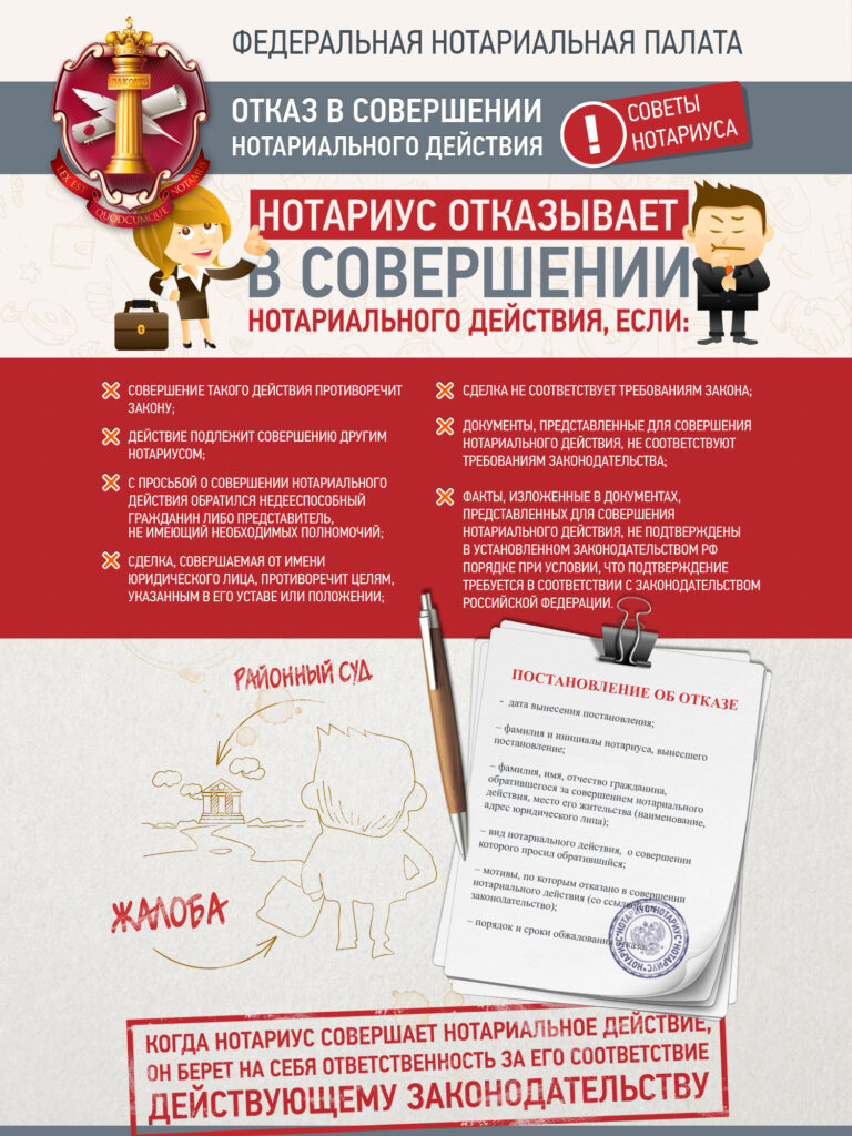Если вы обратились к нотариусу, а он отказал в совершении нотариального действия, то, по вашей просьбе, он должен изложить причины отказа в письменной форме и разъяснить вам порядок его обжалования. Не позднее чем в десятидневный срок со дня обращения за совершением нотариального действия нотариус должен вынести постановление об отказе в совершении нотариального действия.